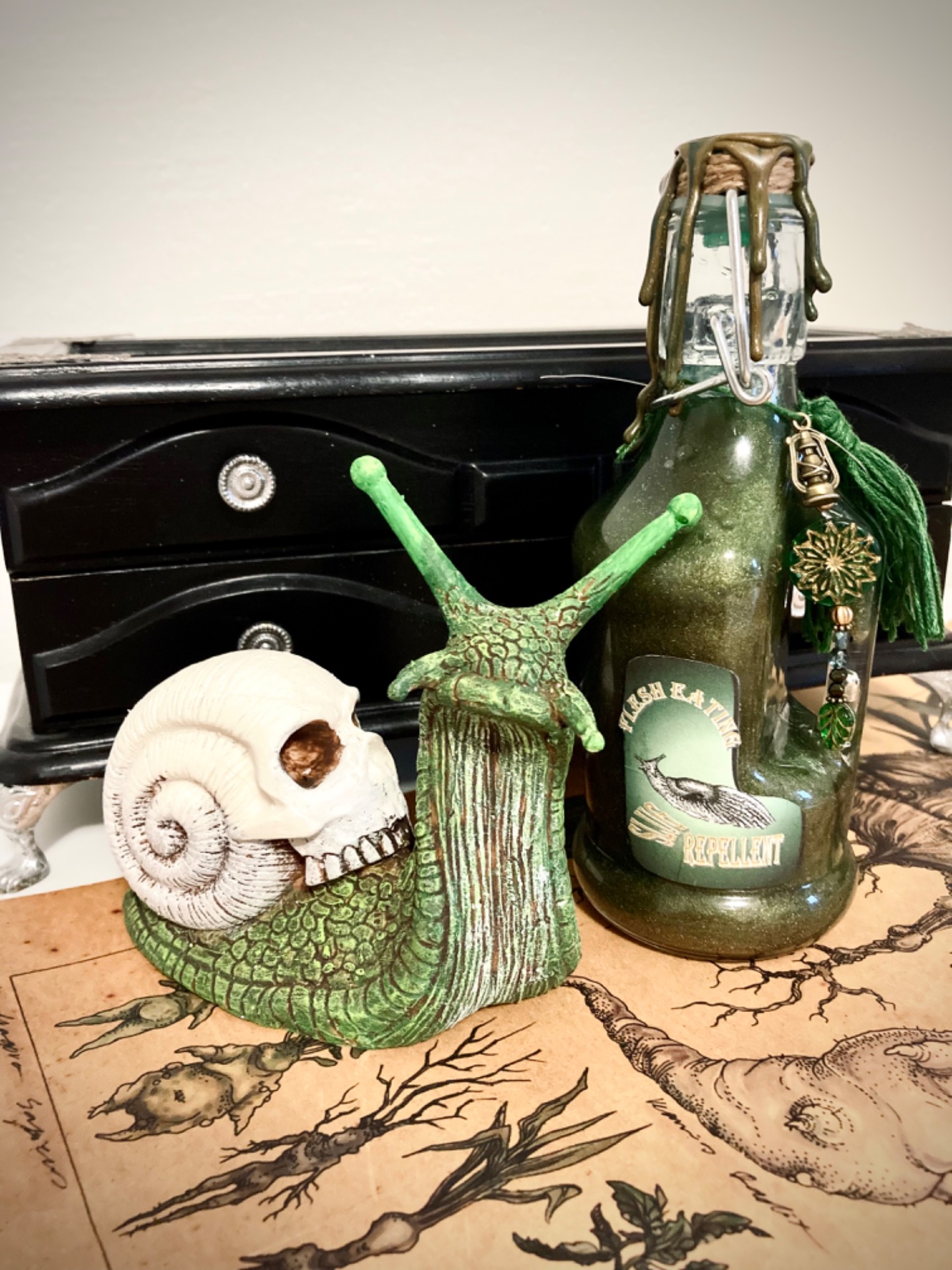 Lektvar "Repelent proti masožravým slimákům" v lahvičce zdobené komponenty a voskovou pečetí. Po protřepání má lektvar zeleno-bronzovou barvu s magickými perleťovými odlesky. Doba dodání je cca 7 dní
